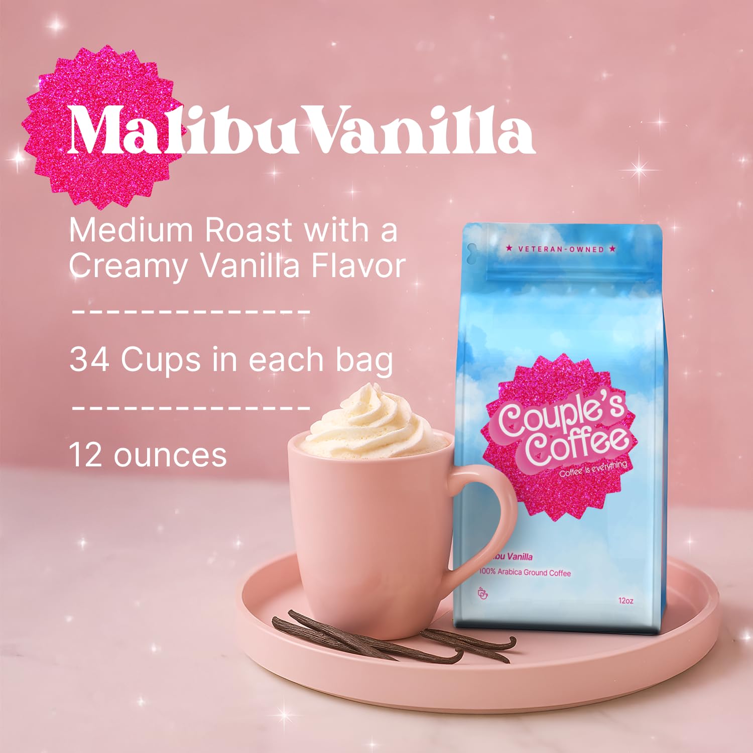 Couple's Coffee Vanilla Coffee Grounds | Malibu Vanilla Flavored Coffee | Pink Coffee Gifts for Women | Gives Back to Military Families | Medium Roast Made with 100% Arabica Beans | 12oz